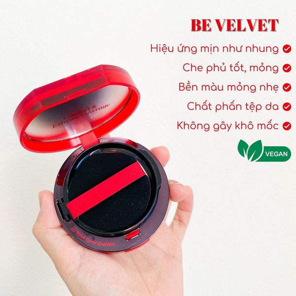 Cushion Pro Tailor Be Velvet Cover là dòng phấn nước thuần chay bán lì (semi-matte) với kết cấu mềm và mịn như nhung, độ ẩm hợp lý với cả da khô lẫn dầu sẽ nhẹ nhàng bao phủ và đem lại hiệu quả cover khuyết điểm tốt. Thành phần bột Sapphire trắng (alumina) kết hợp oil dưỡng ẩm, kem lót khóa ẩm, PHA và Panthenol sẽ đem lại làn da mịn mướt