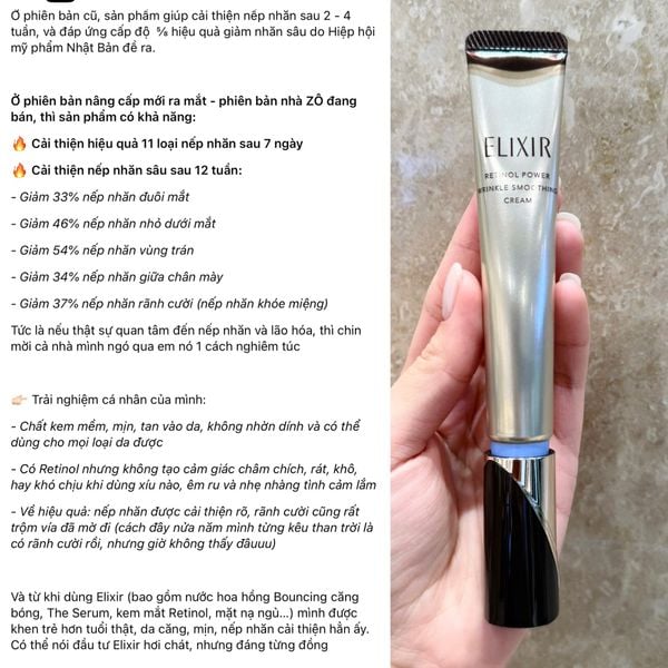 Kem mắt Retinol giảm nhăn Elixir Superieur Retinol Power Wrinkle Cream là sản phẩm bán chạy số 1 trên thị trường mỹ phẩm cải thiện nếp nhăn trong 6 năm liên tiếp. Kem dưỡng sở hữu thành phần độc quyền “Pure Retinol” của Shiseido - là Retinol duy nhất ở Nhật Bản được Bộ y tế và Phúc lợi Nhật công nhận hiệu quả đặc trị nếp nhăn trên toàn khuôn mặt và vùng cổ chỉ sau 7 ngày đối với 11 loại nếp nhăn: vết chân chim, nếp nhăn trán, rãnh cười, nếp nhăn dưới mắt, rãnh lệ, nếp nhăn ấn đường, rãnh khóe miệng, nếp nhăn sống mũi, rãnh giữa má, nếp nhăn cổ, nếp nhăn sâu khác,...
