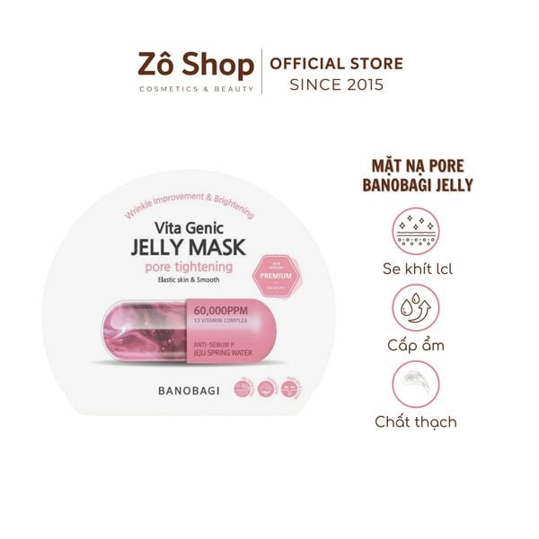Mặt nạ Banobagi Vita Genic Jelly Pore Tightening với thành phần từ suối nước nóng Jeju và phức hợp Vitamin giúp da mịn màng, hỗ trợ thu nhỏ lỗ chân lông, đồng thời cân bằng độ ẩm dầu trên da, kiểm soát bã nhờn dư thừa và tăng săn chắc cho da.