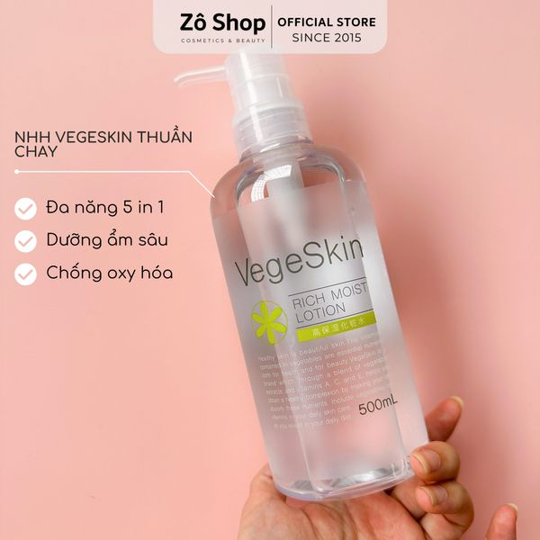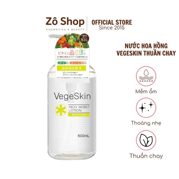 VegeSkin Rich Moist Lotion là nước hoa hồng thuần chay chứa hơn 93% thành phần tự nhiên, kiêm cùng lúc 5 tính năng của toner, mặt nạ, serum, kem lót dưỡng ẩm và body lotion